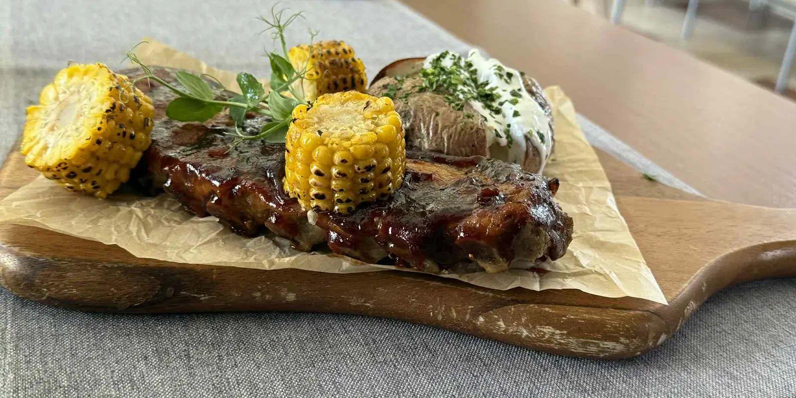 BBQ Ribs (oldalas) héjában sült burgonyával, grillezett kukoricával