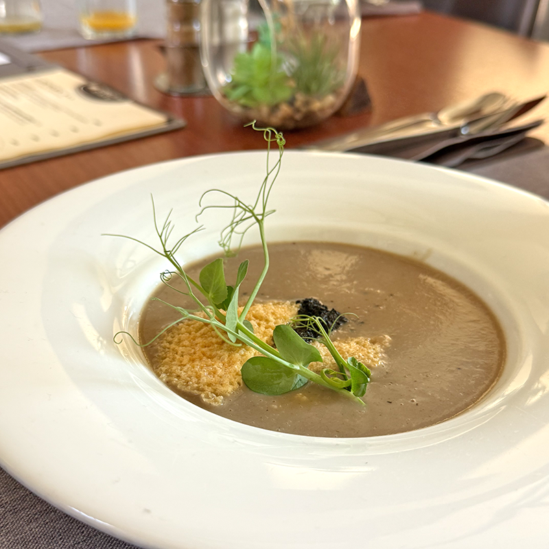 Szarvasgombás erdei gombakrémleves parmezánropogóssal